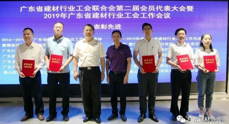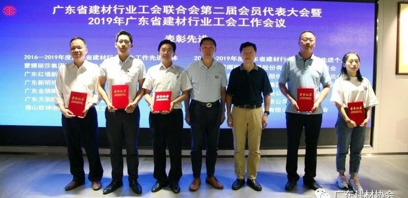 会上,对2016—2019年度广东省建材行业工会工作先进集体和个人进行了表彰,蒙娜丽莎、红墙、新明珠、金牌陶瓷、天弼陶瓷、欧神诺陶瓷等单位工会荣获先进集体,蔡莉莉、和卓波、简耀康、蒙胜炜、毛有新、张亚奇等荣获先进个人。