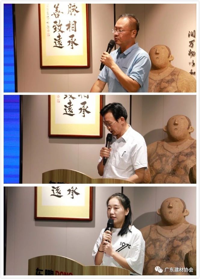 ▲广东省建材协会秘书长刘莲香当选常务副主席(左一),瓷海国际佛山陶瓷交易中心有限公司副总裁、瓷海国际工会联合会主席林莹当选副主席并兼任女职工委员会主任(右二),广东省建材协会会长助理王卫国当选副主席并兼任经费审查委员会主任(右一)